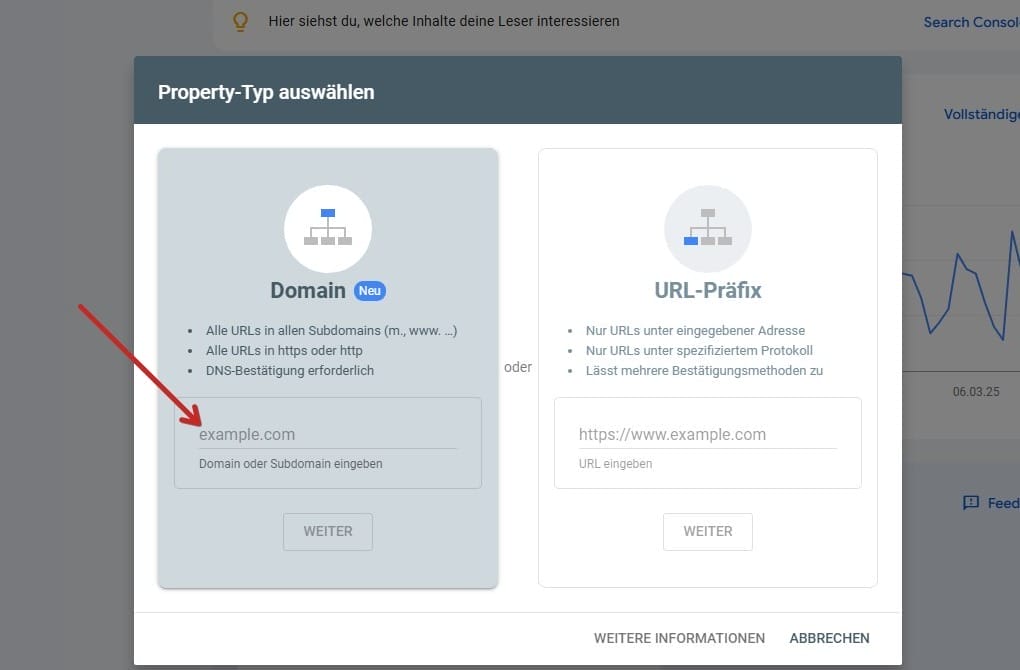 Bei der Auswahl der Property-Art gibt es zwei Hauptoptionen: die Domain-Property und die URL-Präfix-Property. Die Domain-Property erfordert nur die Eingabe der Second-Level-Domain, also deinewebsite.de, ohne das www. Diese Art gilt für alle Subdomains und ist praktisch, wenn du eine Website mit mehreren Subdomains betreibst.